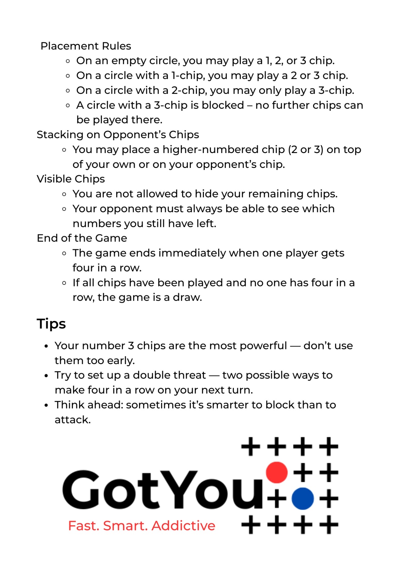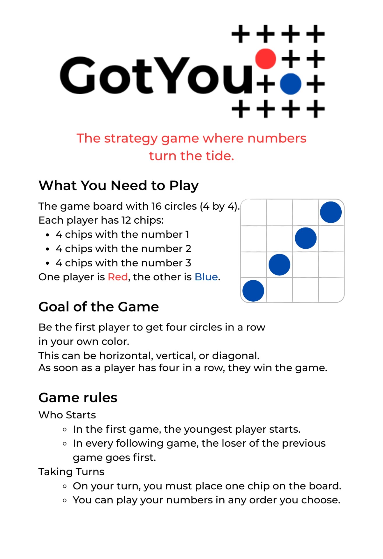The GotYou box includes: 1 Game board (16 circles) 12 red chips 12 blue chips Rule sheet